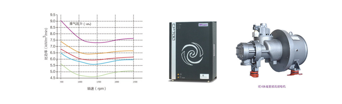 低轉速的螺桿轉子選型:在對螺桿轉子的長期測試跟研究中,我們發現:螺桿轉子的比功率隨著主機轉速的提高,先減小后增大。存在著較佳主機轉速,使得螺桿壓縮機的能效明顯提高。因此我們在設計ZLS-Hi+系列主機時,選擇優質的電機搭配更佳轉速下的主機,使我們的每個轉子都在對應的轉速中工作,做到優質能效比。